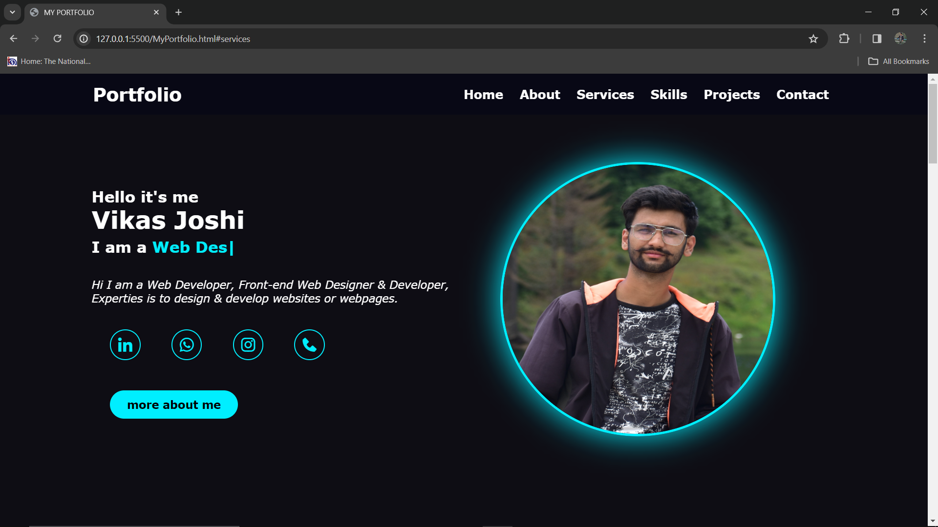 Designed and developed a dynamic personal portfolio website utilizing HTML, CSS and JS, showcasing skills, projects and contact information. In this webpage I have implemented a navigation bar for seamless navigation and webpage divided into six sections: Home (intro), About, Services, Skills, Projects and contact.