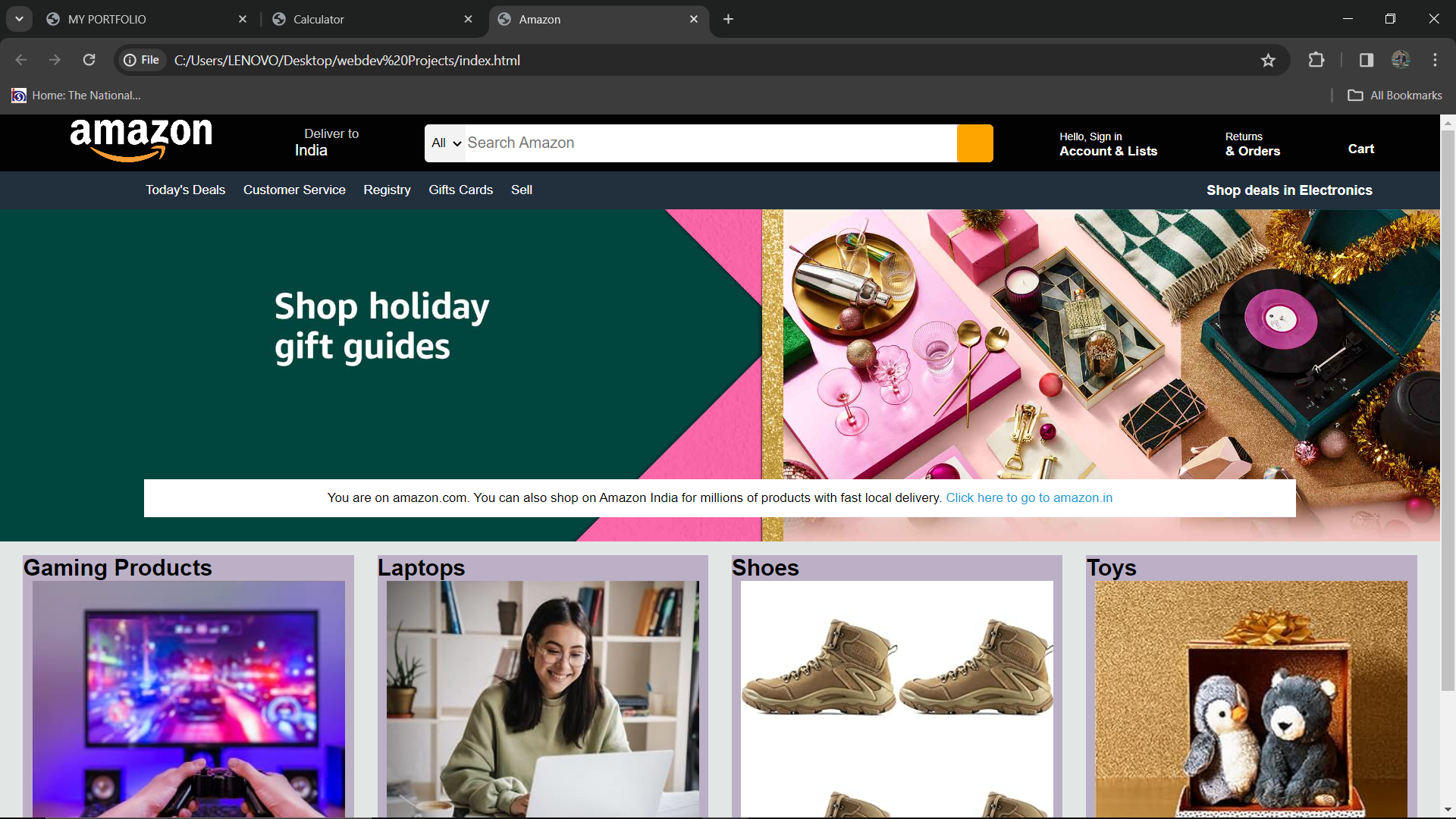 I have designed fully functional clone of the Amazon web-page using HTML and CSS, showcasing proficiency in front-end development. Implemented essential components such as a navigation bar for seamless navigation, a hero image section for user attention, and a product section featuring various types of products similar to Amazon catalog.